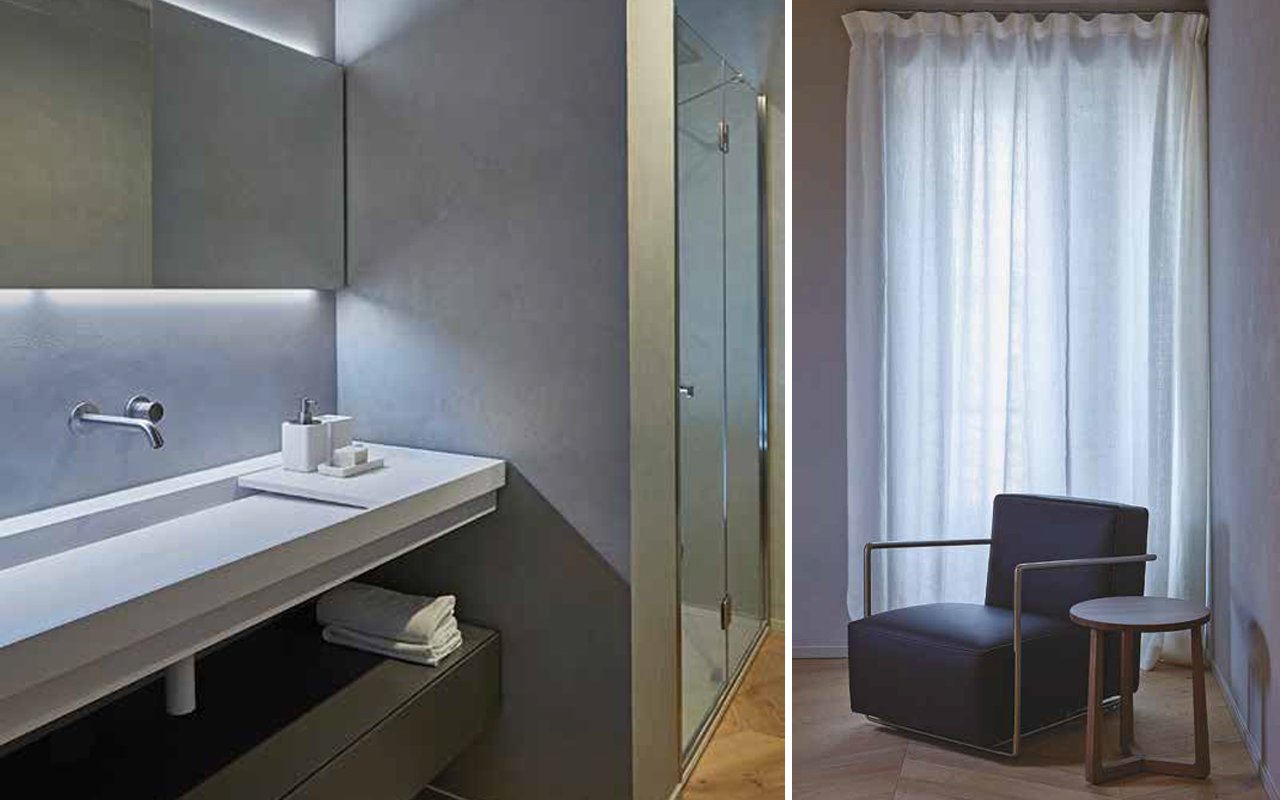 The natural shade of lime finishing for the walls — repeated on the ancient wooden ceiling too — creates a soft background that matches the contemporary durmast floor. A design dimension aimed at an original idea of beauty. What attracts is the feeling that comes from sought-after materials, out of character shapes, handworks which result in the wall covering of the scenery flat that separates the living area from the sleeping one. A hidden door leads you to private and intimate spaces: that is to say two double bedrooms. The master bedroom boasts a glazed walk-in closet at the headboard which — thanks to its transparency — breaks down the preset borders without affecting the perception of lightness and continuity. Selected and iconic design features, pieces of furniture and lighting elements complete the creation and contribute to the taste and the attention to detail of this new makeover.