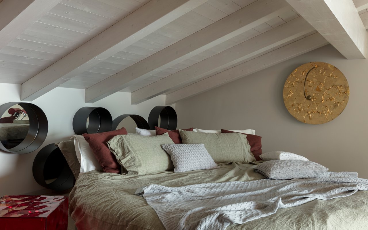 Next to the family sofa, several design elements stand out, such as the Gyrofocus fireplace, by the French company Focus, the Button Tables by B&B Italia and the Tabouret coffee tables and LC4 chaise longue by Cassina. The light-coloured rug is of Berber origin while the red, antique carpet belongs to the family. Great attention was paid to the interior design of the On Off kitchen by Boffi. Visually, the use of white and Corian, with its reflective surface, makes the space appear larger than it really is. Spatial continuity and its elongation is also ensured by the Axis table, by Acerbis, made of glass, positioned along the length of the kitchen and surrounded by Bertoia chairs by Knoll, with a hanging lamp designed by Catellani&Smith. Also on the ground floor is a bedroom with a Privè bed by Ivano Redaelli and a bathroom with a split black slate wall, furnished with the Ottocento bathtub by Agape and the Index Bifacciale round mirror, also by Boffi. On the upper floor there is also a loft, which overlooks the living area, and the master bedroom with its bathroom. Space is also given to design in these rooms: the master bedroom in the attic is furnished with the Glamour bed by Redaelli, while the bedside tables are from Kartell and the mirrors behind the bed are I Punto, by Minottiitalia. Thanks to these interesting furnishing choices, the functional and emotional wishes of the owners were fulfilled. And only with this philosophy has a near-perfect design been created, almost… leaving perfection its share of subjective interpretation. For a home where only experience will bring out the uniqueness of an authentic, chic project, without unnecessary ostentation.