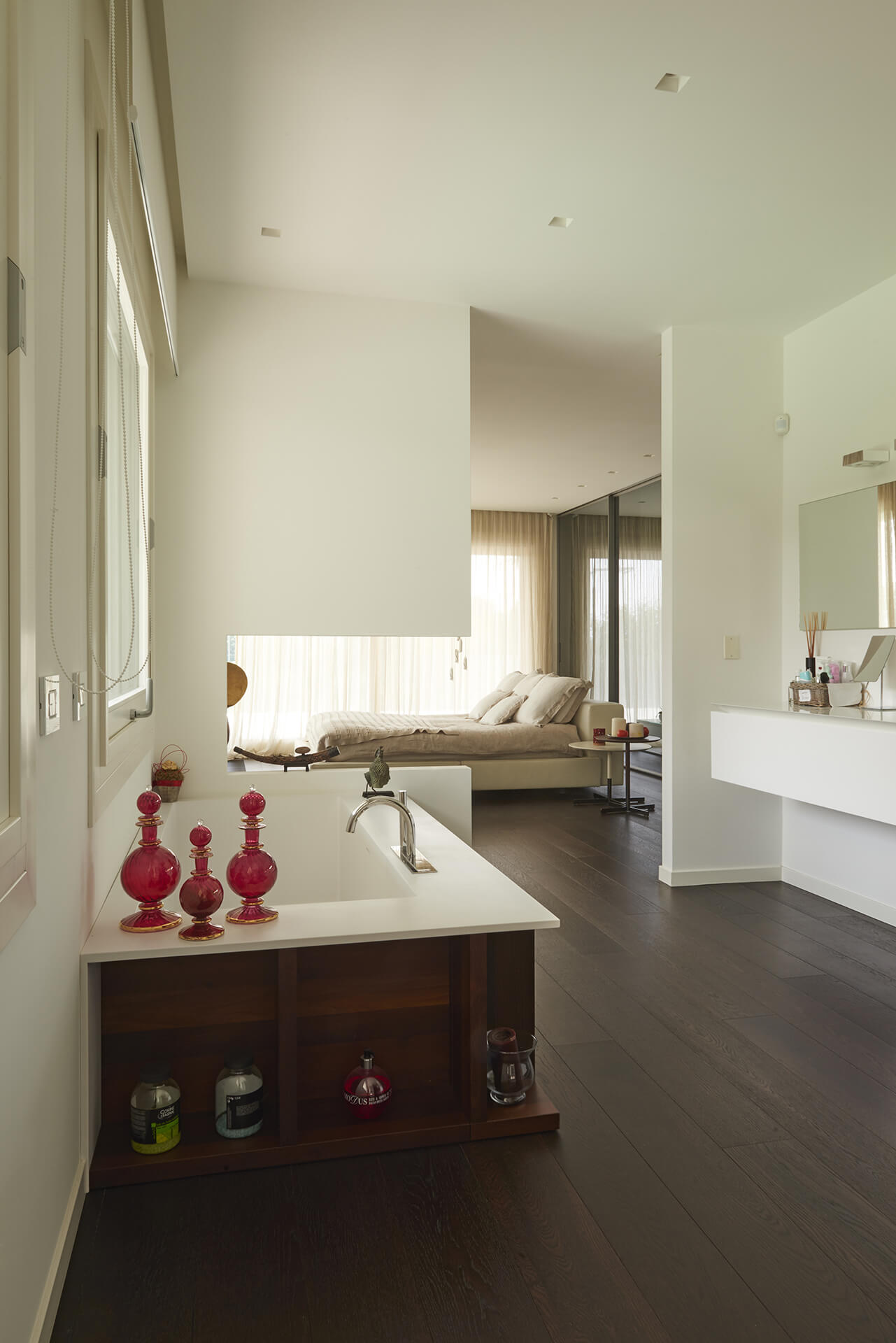There are houses that capture your heart right away. And this villa is the perfect example. We aren’t in Hollywood, although you might be forgiven for thinking we were. This contemporary “sculpture” was designed by Studio Associato di Architettura Arch. Pergreffi S. e Arch. Scola M. An ambitious project in the province of Bergamo whose interiors were overseen by Zenucchi Design Code. “In projects such as this one – explain the Zenucchi interior designers – our job isn’t just limited to providing the furniture. We supported the work of the architects every step of the way, identifying the most suitable accessories but also studying and supplying horizontal and vertical coverings, customised furniture, the lighting, the fixtures and fittings, and all of the most appropriate finishes and solutions for the house.” Four elements shape the style of this house: glass, stone, concrete and wood.