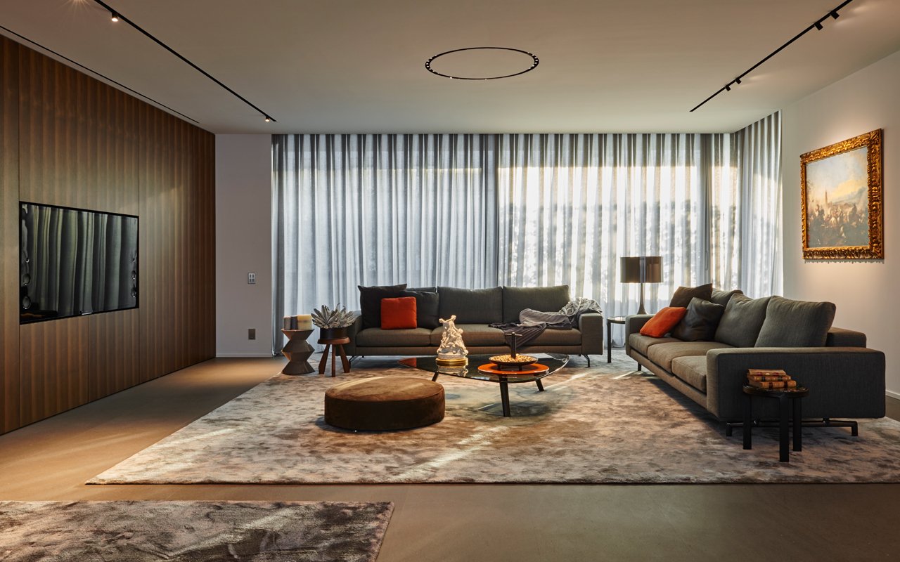 Can a house be both homely and an artistic space in which to savour the beauty of exclusive works of art on a daily basis? Yes it can, because the soul of a home reflects that of its owner, a lover of paintings and classical sculpture. The interior design project was developed by Giacomo Zenucchi taking account of the interests and passions of the homeowner. “The owner shared his space and lighting ideas with us because his aim has always been to showcase his valuable private art collection in a stylish and elegant yet understated way”. This house was developed according to a specific philosophy characterised by very interesting settings and carefully considered compositional, furnishing and finishing choices. The day area is distinctive for its Basaltina stone floor while parquet is used for the night area. Giacomo Zenucchi’s custom interior design creations include, in the daytime area, a very particular wood panel in heat-treated oak which houses the TV area, fireplace and a series of cupboards and storage units before embracing the entrance hall and joining up with the stairwell. A special staircase, redesigned by the interior designers. “Originally the stairs were closed off by walls which we recommended removing in order to create space and enlarge the entrance area. In this way the staircase acquired more importance, making the environment more elegant and welcoming. The Basaltina stone of the floor also covers the walls of the stairwell.
