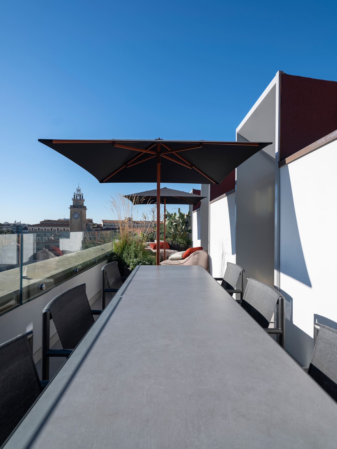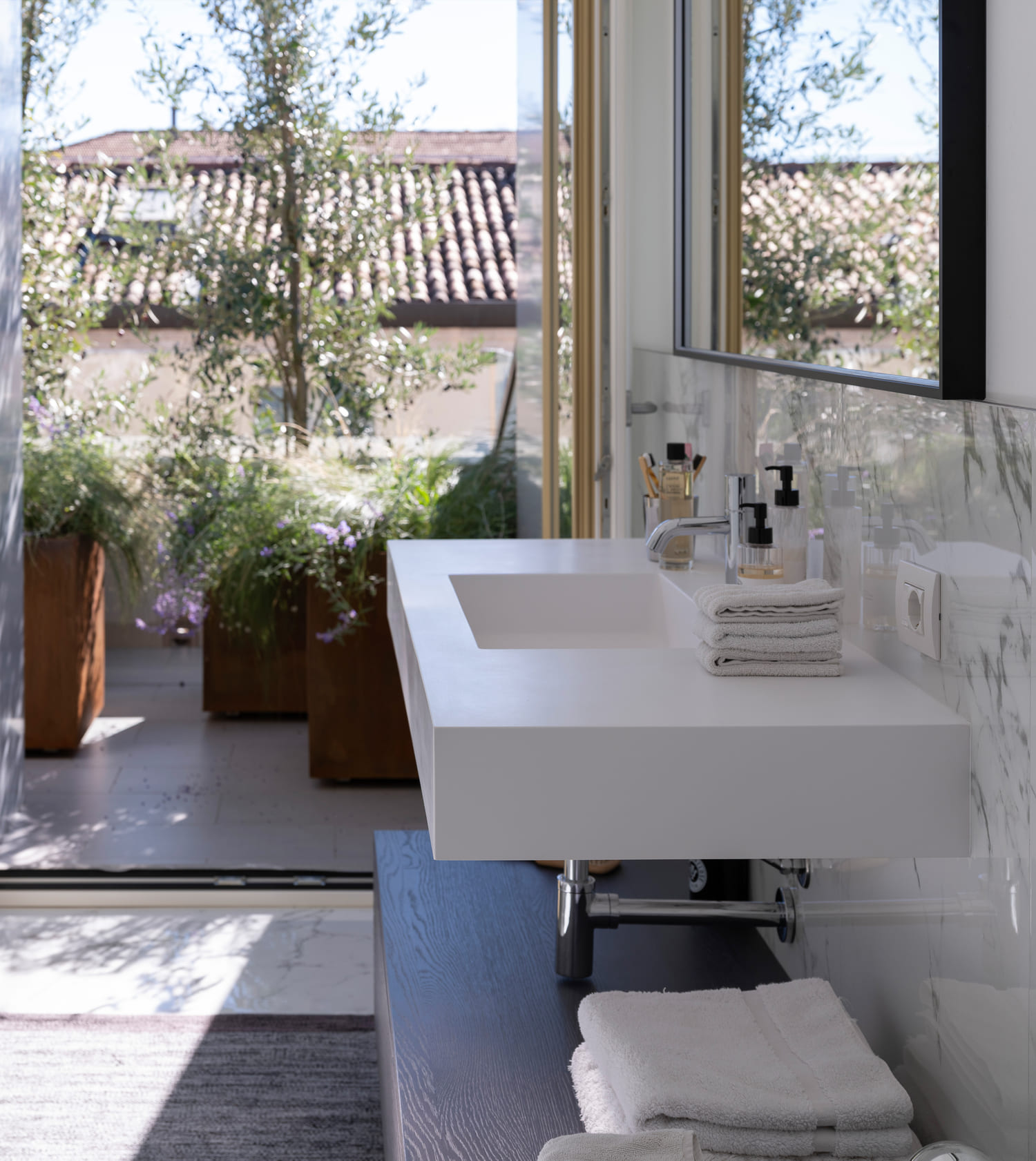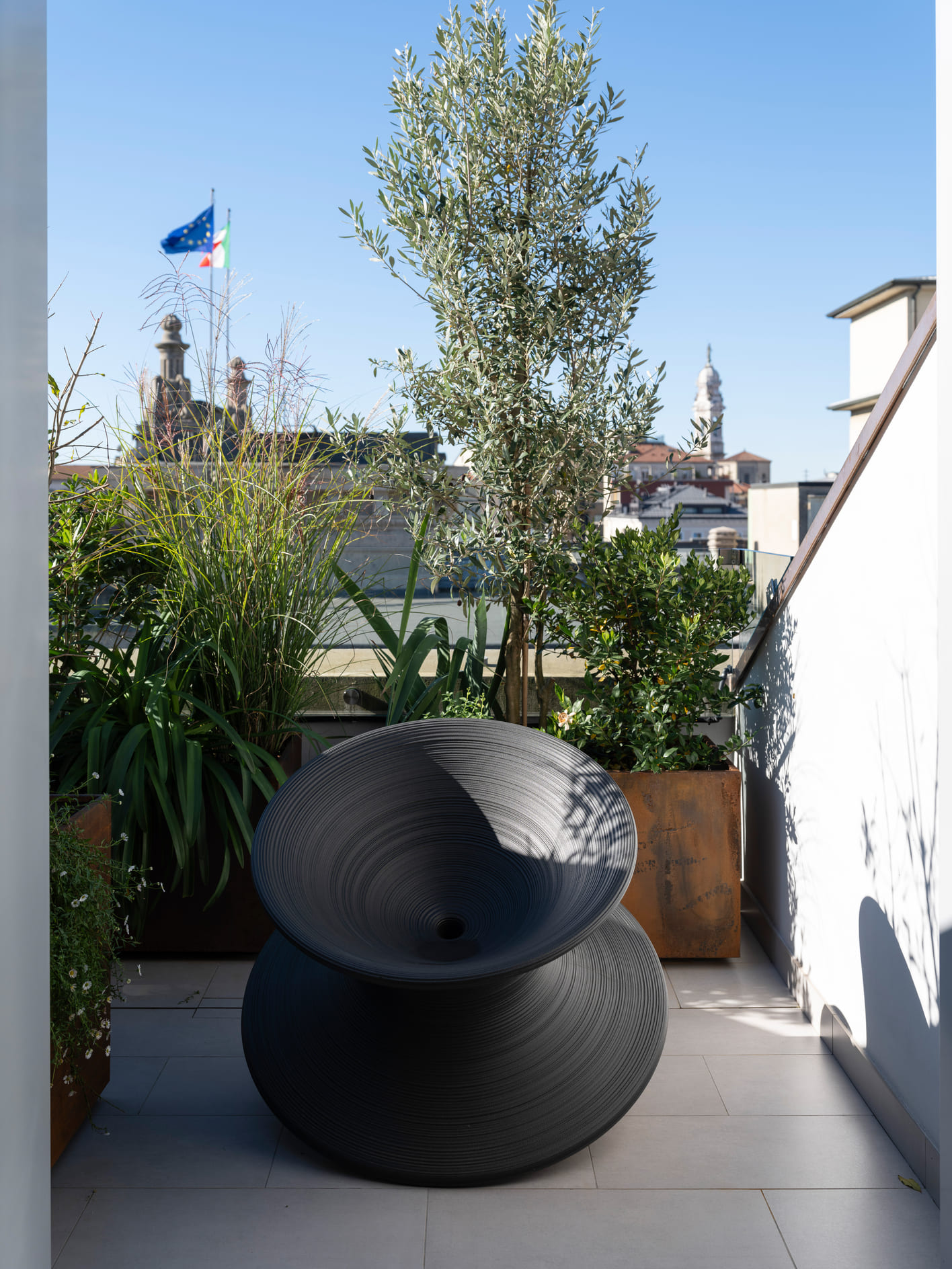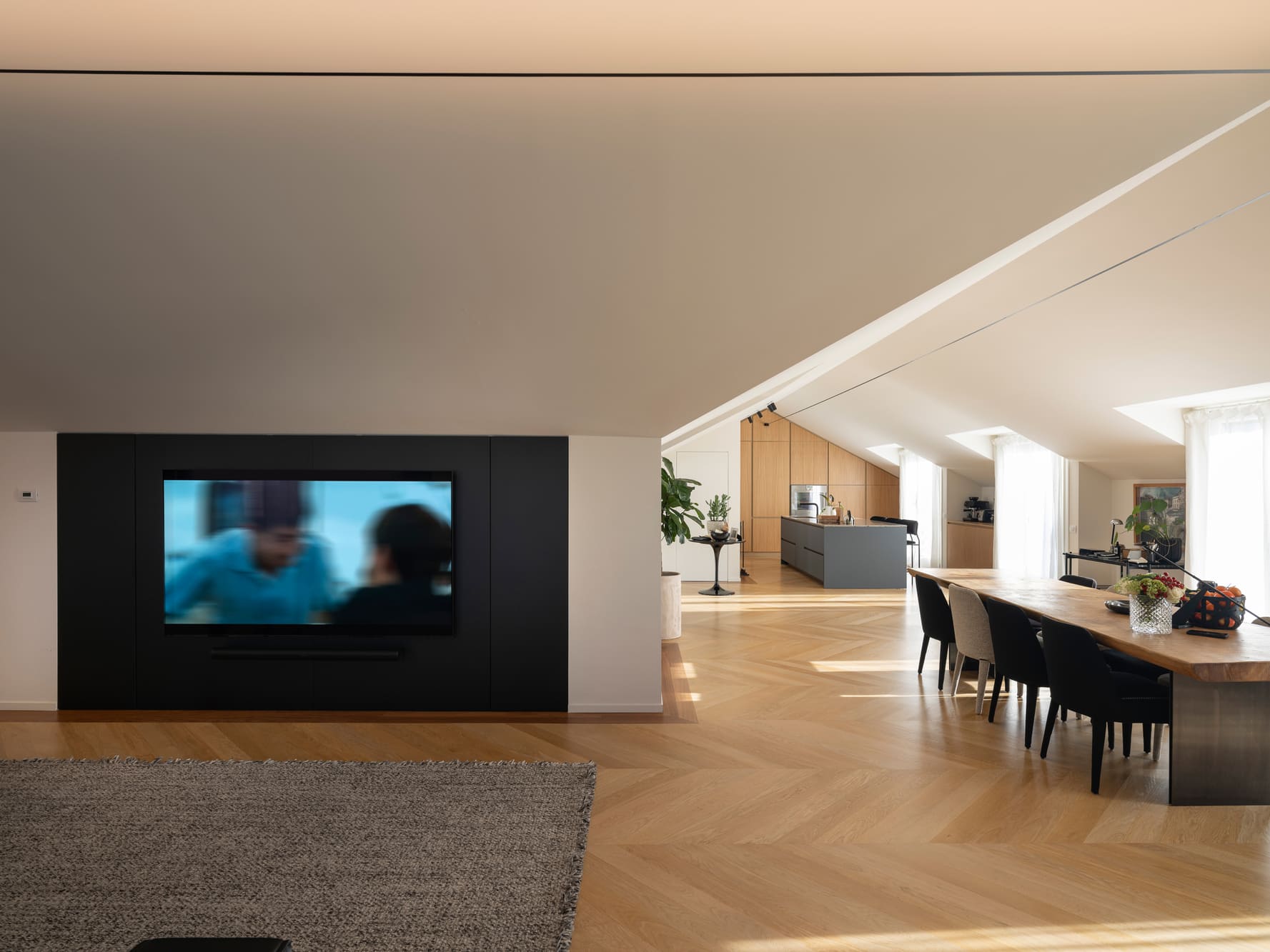 The interior spaces flow seamlessly, without rigid separations, reflecting a fluid and informal daily life. The layout is natural, free of strict hierarchies, designed for a family that inhabits the home with ease, adapting it to their needs without constraints. The furnishings tell a story of layering: iconic pieces inherited from previous homes, new additions carefully selected, bathrooms redesigned with attention to detail and the tactile quality of materials. Nothing is displayed for show—everything is conceived to be lived in, touched, and used over time. The kitchen welcomes immediately, designed to accommodate both lived moments and quick pauses, while the living area maintains balance and openness, featuring a Baxter sofa, Vitra elements, and a B&B rug, complemented by a Porro console. Lighting by Davide Groppi traverses the spaces like a delicate thread, dematerializing the object and leaving room for what truly matters: the light itself. With subtlety and graphic strength, it defines the rhythm of the spaces, emphasizes the ceilings, and interacts with natural light cuts, achieving a delicate balance between presence and absence. Bedrooms and bathrooms continue this natural flow, featuring elements by Agape and Boffi, Kasthall rugs, and thoughtfully detailed lighting solutions. The project extends outdoors with terraces furnished by Paola Lenti, Roda, and Kettal, designed as genuine extensions of living—places for socializing as well as moments of pause. The result is a home to be inhabited naturally, where interiors and exteriors converse in harmony, and the design supports daily life with discretion and continuity. A sunlit home: a place where beauty is everyday, understated, and profoundly human.