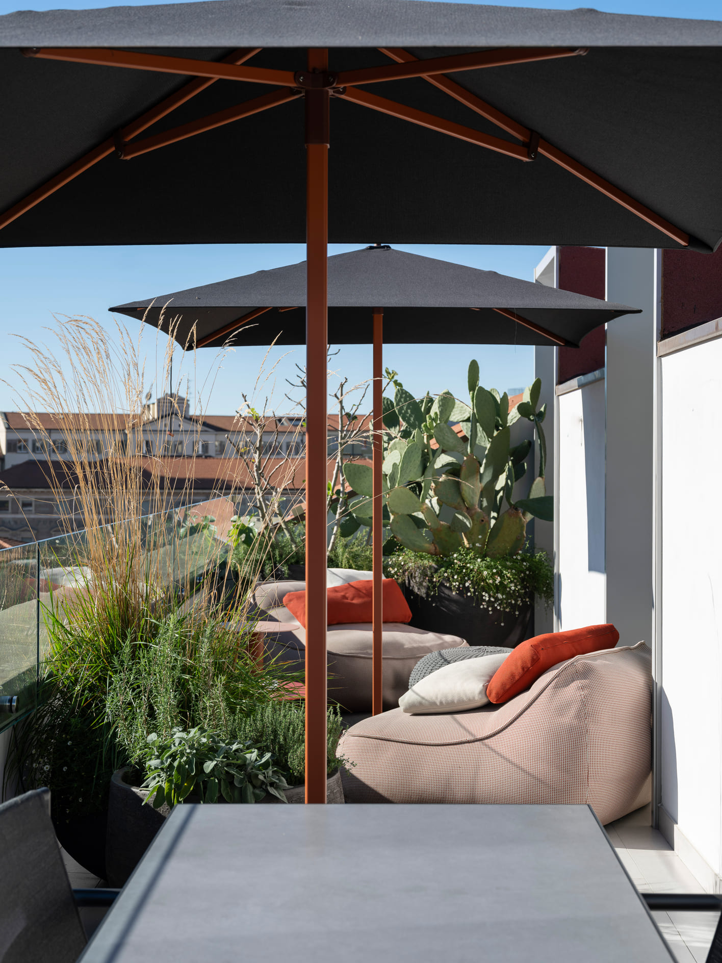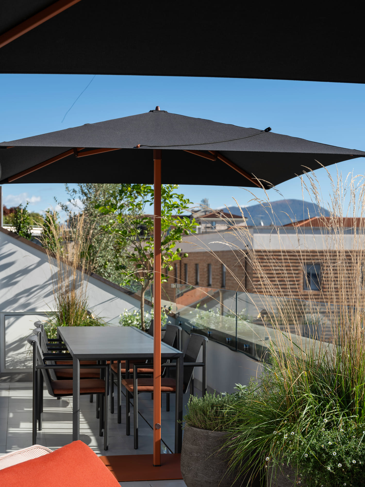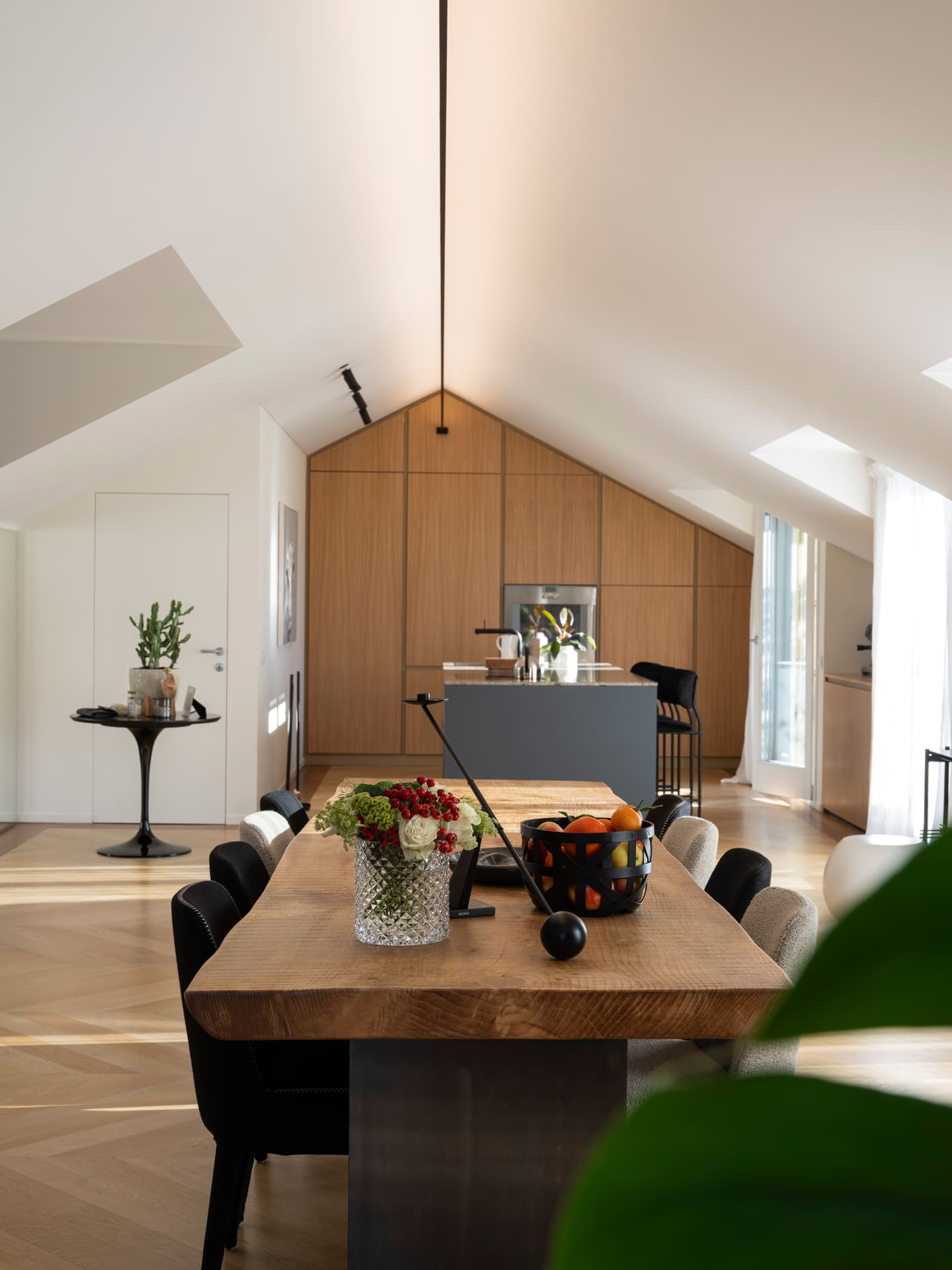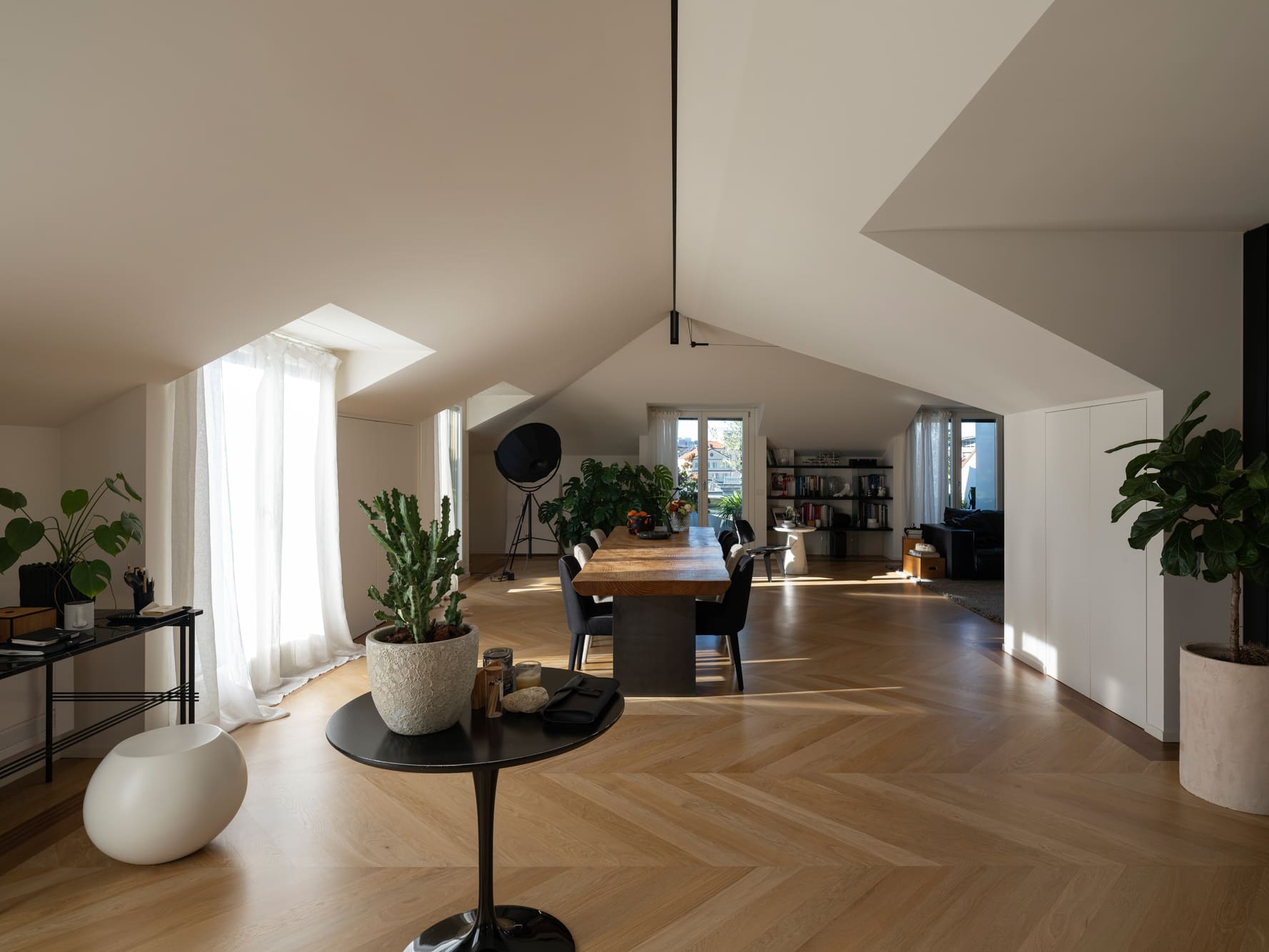 The interior spaces flow seamlessly, without rigid separations, reflecting a fluid and informal daily life. The layout is natural, free of strict hierarchies, designed for a family that inhabits the home with ease, adapting it to their needs without constraints. The furnishings tell a story of layering: iconic pieces inherited from previous homes, new additions carefully selected, bathrooms redesigned with attention to detail and the tactile quality of materials. Nothing is displayed for show—everything is conceived to be lived in, touched, and used over time. The kitchen welcomes immediately, designed to accommodate both lived moments and quick pauses, while the living area maintains balance and openness, featuring a Baxter sofa, Vitra elements, and a B&B rug, complemented by a Porro console. Lighting by Davide Groppi traverses the spaces like a delicate thread, dematerializing the object and leaving room for what truly matters: the light itself. With subtlety and graphic strength, it defines the rhythm of the spaces, emphasizes the ceilings, and interacts with natural light cuts, achieving a delicate balance between presence and absence. Bedrooms and bathrooms continue this natural flow, featuring elements by Agape and Boffi, Kasthall rugs, and thoughtfully detailed lighting solutions. The project extends outdoors with terraces furnished by Paola Lenti, Roda, and Kettal, designed as genuine extensions of living—places for socializing as well as moments of pause. The result is a home to be inhabited naturally, where interiors and exteriors converse in harmony, and the design supports daily life with discretion and continuity. A sunlit home: a place where beauty is everyday, understated, and profoundly human.