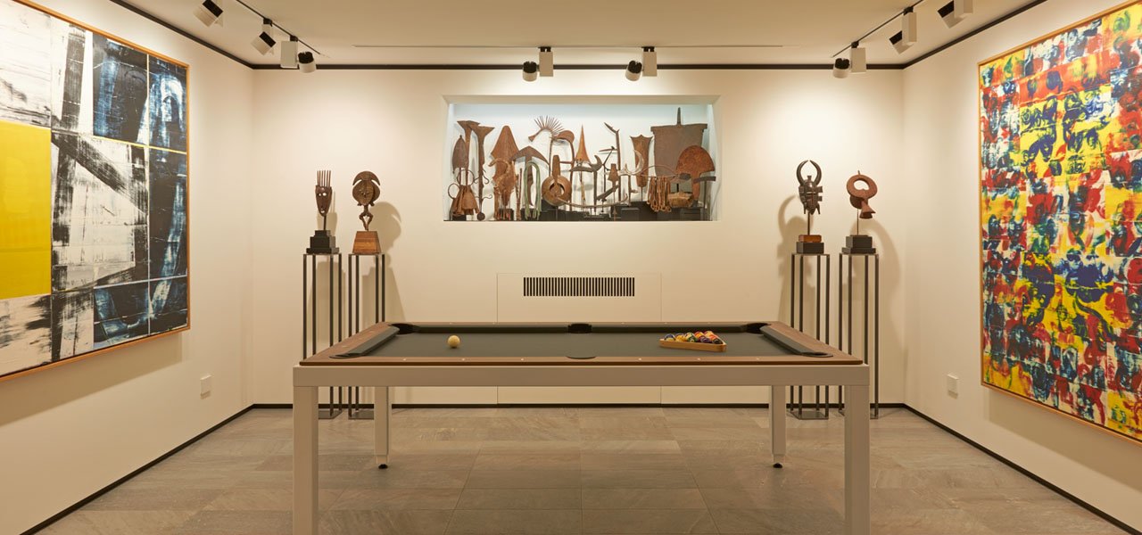 There is a long corridor in which the doors seem to disappear. It is black, that corridor. And it is full of light. On its lowered ceiling there is a small slot in which round lights are inserted and alternate. The rays illuminate the walls, and with them, the paintings and their images. It is from here, from this long, black corridor, that the project by Dep Studio and Zenucchi Design Code takes form. We are in the home of an art collector, and we need to give prominence to those works. Paintings, photographs and sculptures by Italian and international artists from the 1950s to the present day. And so, in this art-rich home, everything else takes a step back. Design. Material. Colour. Starting with that very corridor, with its split sandstone and the flush doors. The room it leads to is the opposite. Different, complementary. It is a large white room, coloured only with the ochre of a patchwork rug. It is a space of leisure, art and entertainment. The 202 8 sofa by Piero Lissoni (2014, Cassina) faces the TV and the bookcase that Dep Studio designed. At its side, the iconic Grand Repos armchair by Antonio Citterio (2011, Vitra); behind it, a billiard table that becomes a dining table. Although the light is completely artificial – LED projectors, with tracks embedded in the ceiling, – the atmosphere is warm, comfortable. The different switch on and intensity adjustment system allows for the creation of different moods and impressions. The ventilated crawl space, plasterboard false walls and automatic ventilation system insulate and protect. Colouring the walls there is only art. With its greens, with its yellows. Abstract shapes of dreams and fantasies.
