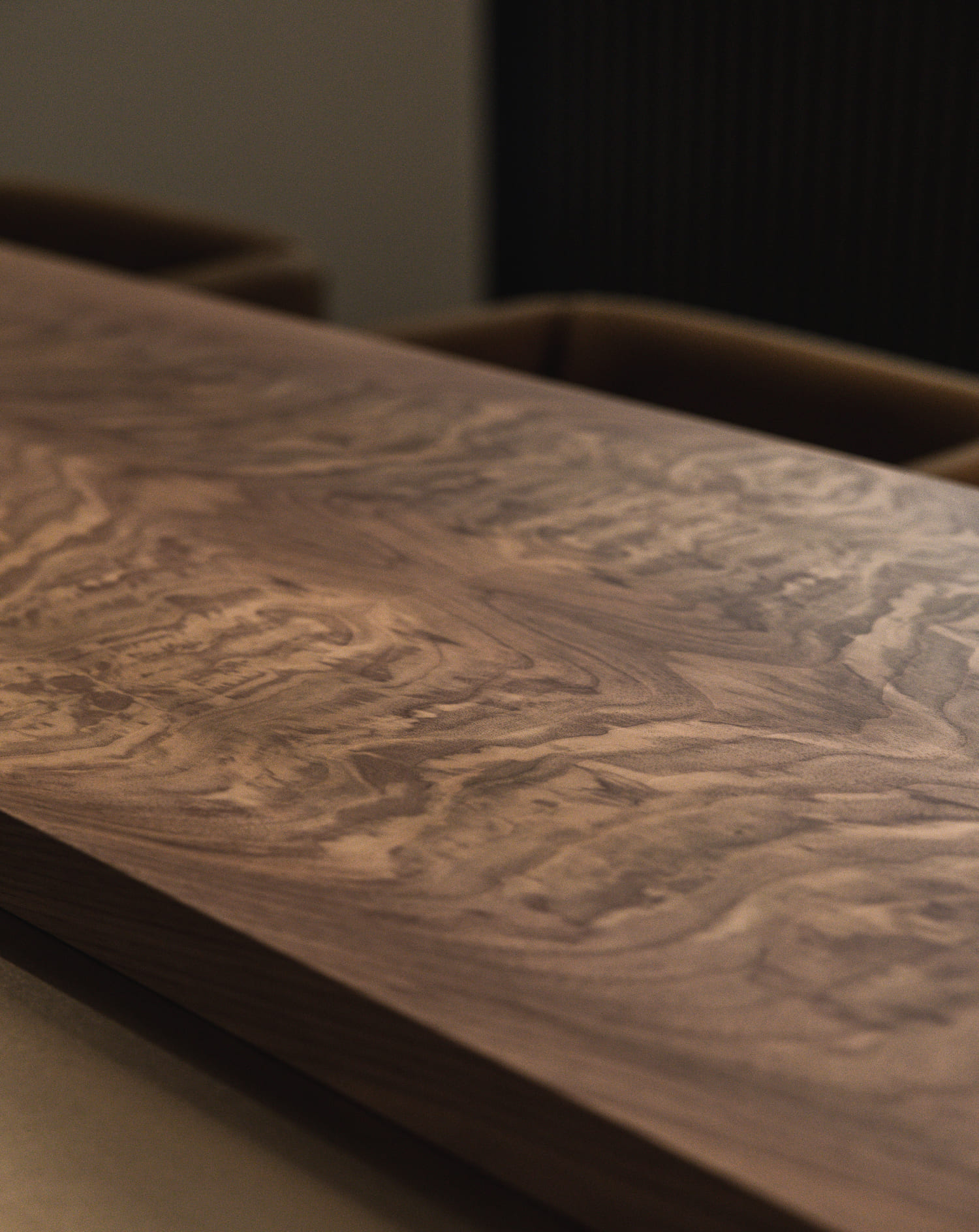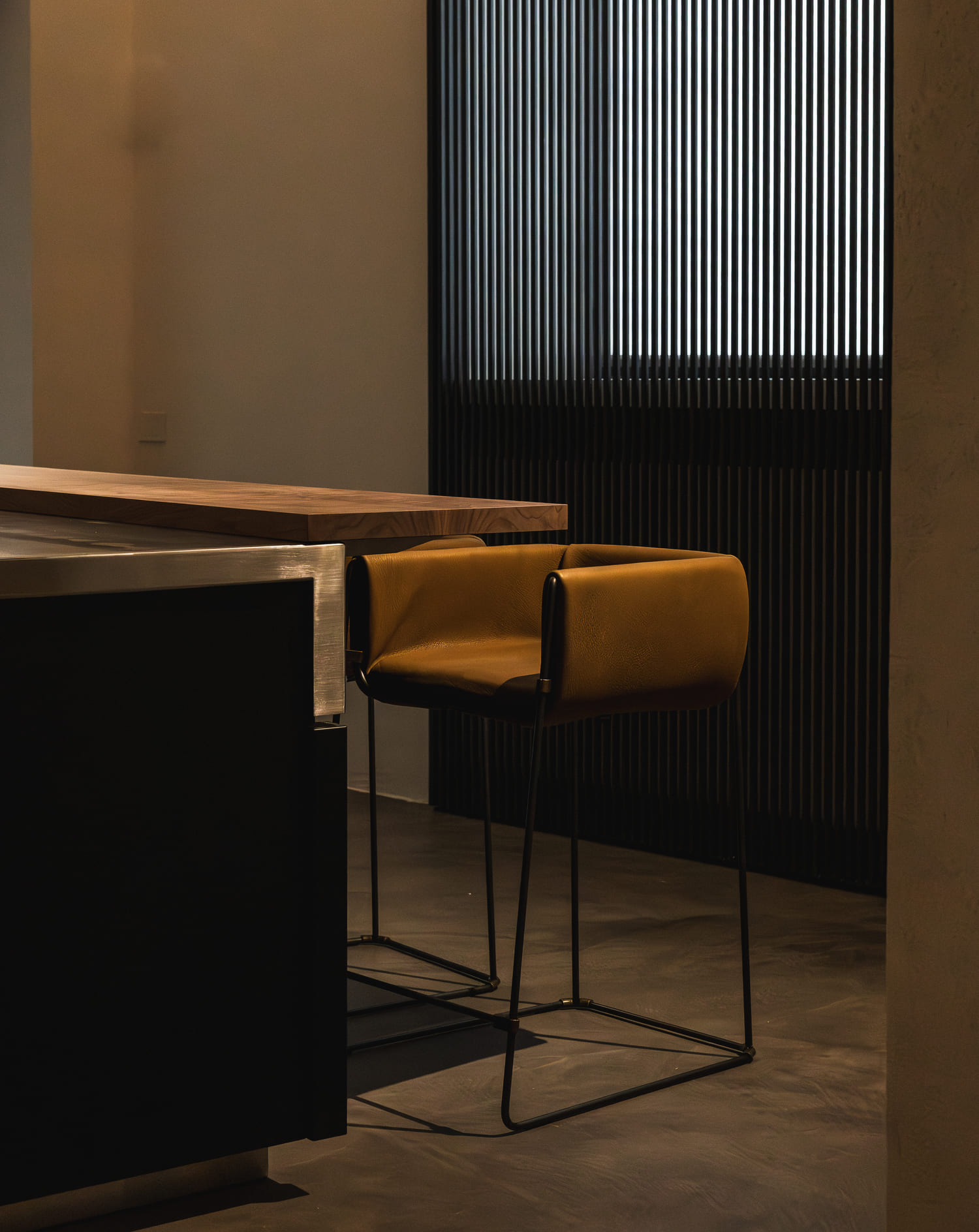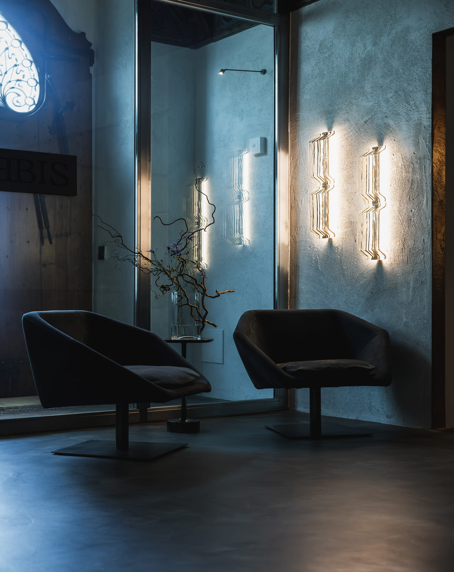 Henge is the protagonist of the project, expressed through a coordinated ensemble of furnishings and lighting solutions that flows throughout the entire space. Its strong presence creates a cohesive and transversal identity, where every element contributes to a complete and coherent design system, deeply integrated with the architecture. Material is Rebis’ true language. The Ozone counter, with its Stone finish in Purple Storm, introduces a deep, vibrant surface veined to evoke the natural strength of stone. Different textures, from soft, velvety suede to more compact, silky nubuck, along with burnished metals and stone surfaces, are combined with careful precision. Pewter cast metals interact with burnished platinum, steel, and titanium finishes, producing controlled, tactile reflections. Precious woods, such as natural featherwood, complete a measured and enveloping palette. Rebis thus reveals itself as a space to be experienced slowly, where design accompanies the journey, and time itself becomes part of the story.
