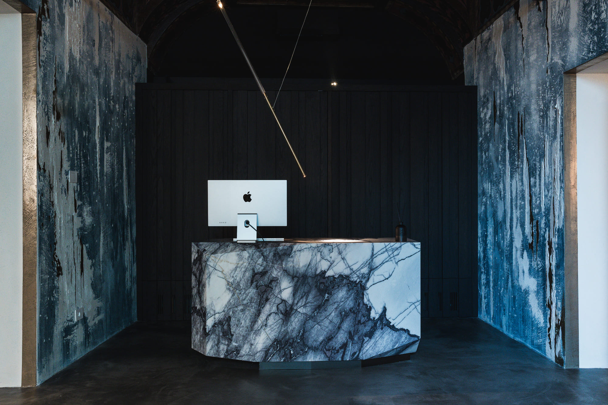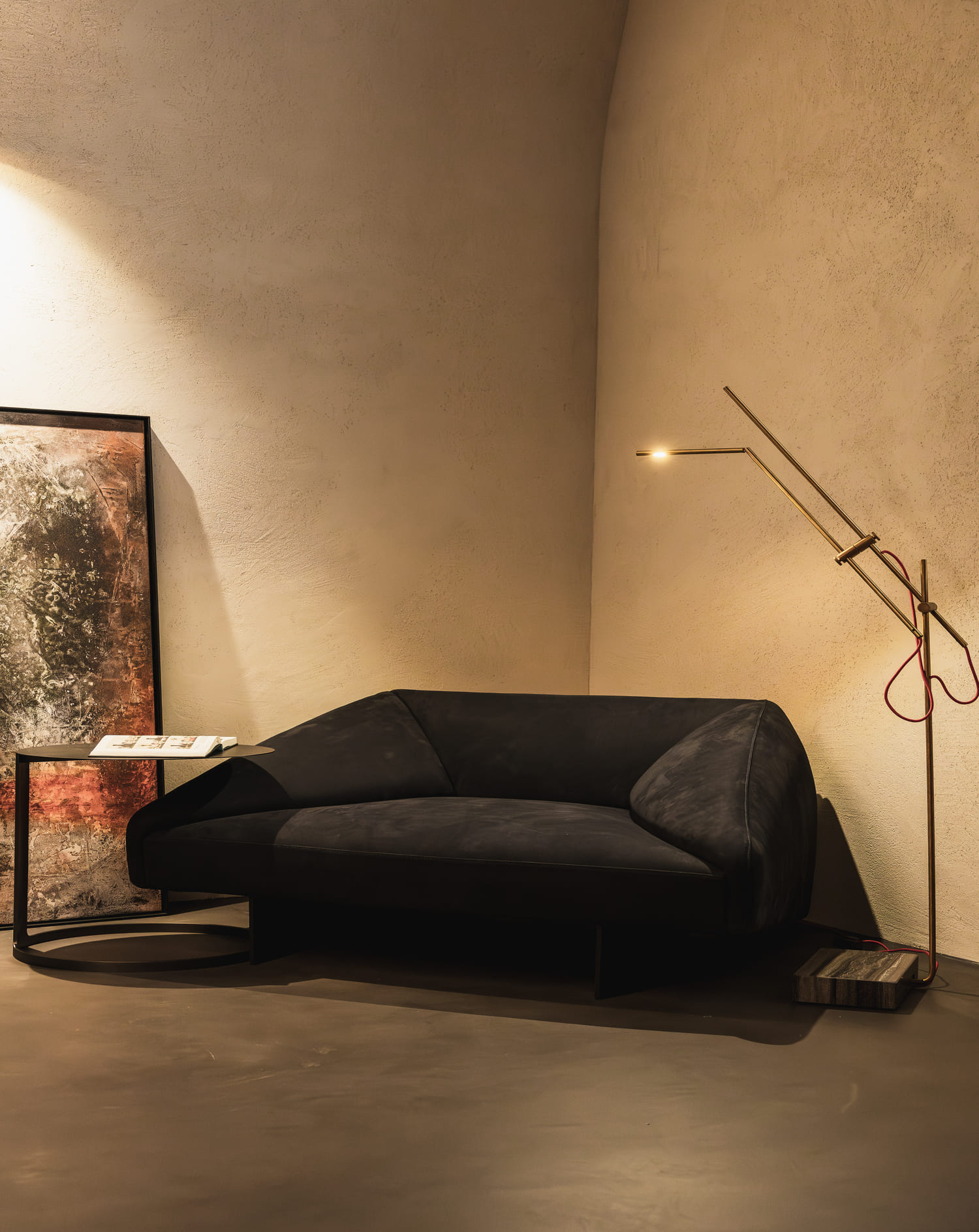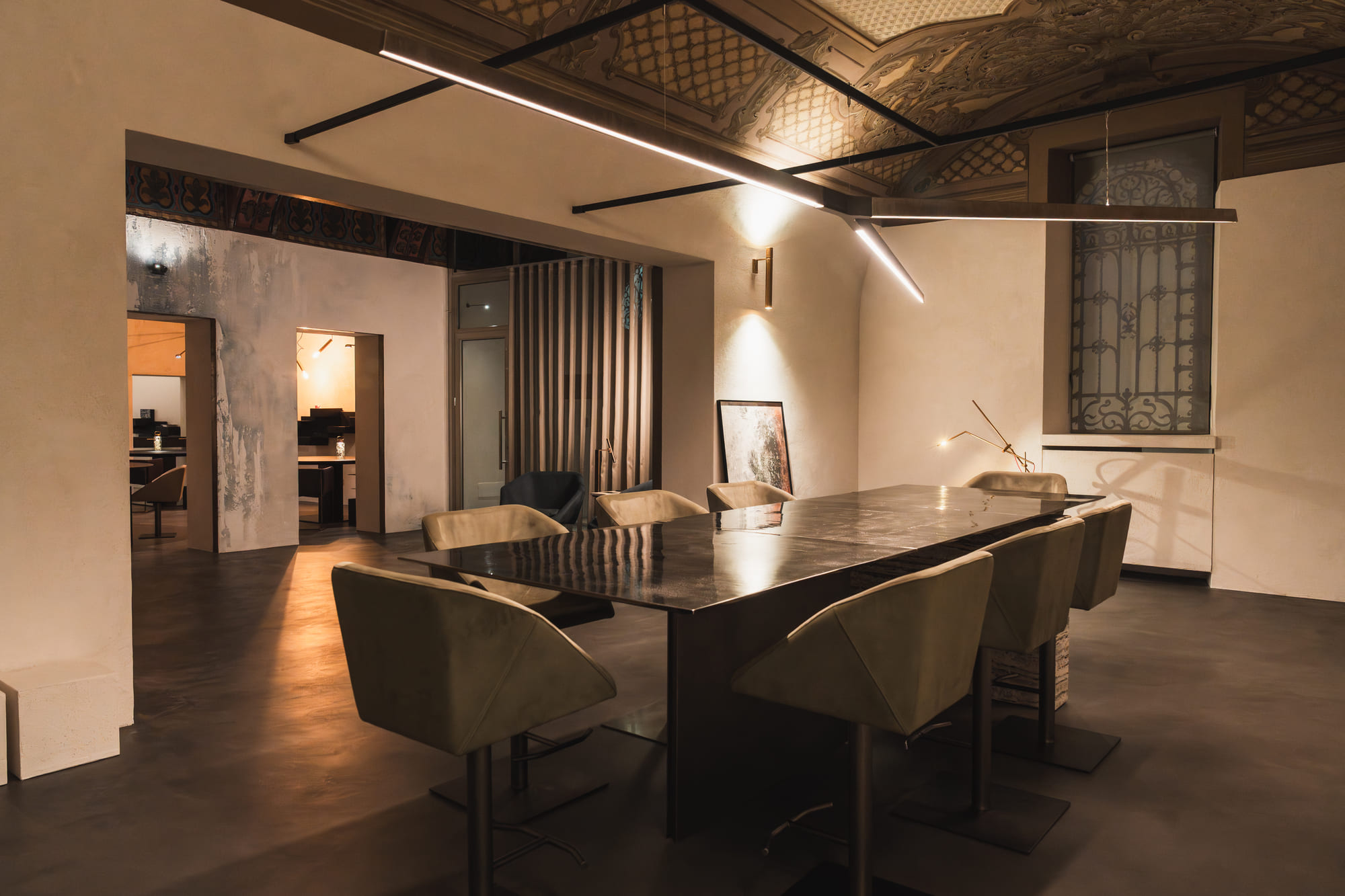 Henge is the protagonist of the project, expressed through a coordinated ensemble of furnishings and lighting solutions that flows throughout the entire space. Its strong presence creates a cohesive and transversal identity, where every element contributes to a complete and coherent design system, deeply integrated with the architecture. Material is Rebis’ true language. The Ozone counter, with its Stone finish in Purple Storm, introduces a deep, vibrant surface veined to evoke the natural strength of stone. Different textures, from soft, velvety suede to more compact, silky nubuck, along with burnished metals and stone surfaces, are combined with careful precision. Pewter cast metals interact with burnished platinum, steel, and titanium finishes, producing controlled, tactile reflections. Precious woods, such as natural featherwood, complete a measured and enveloping palette. Rebis thus reveals itself as a space to be experienced slowly, where design accompanies the journey, and time itself becomes part of the story.