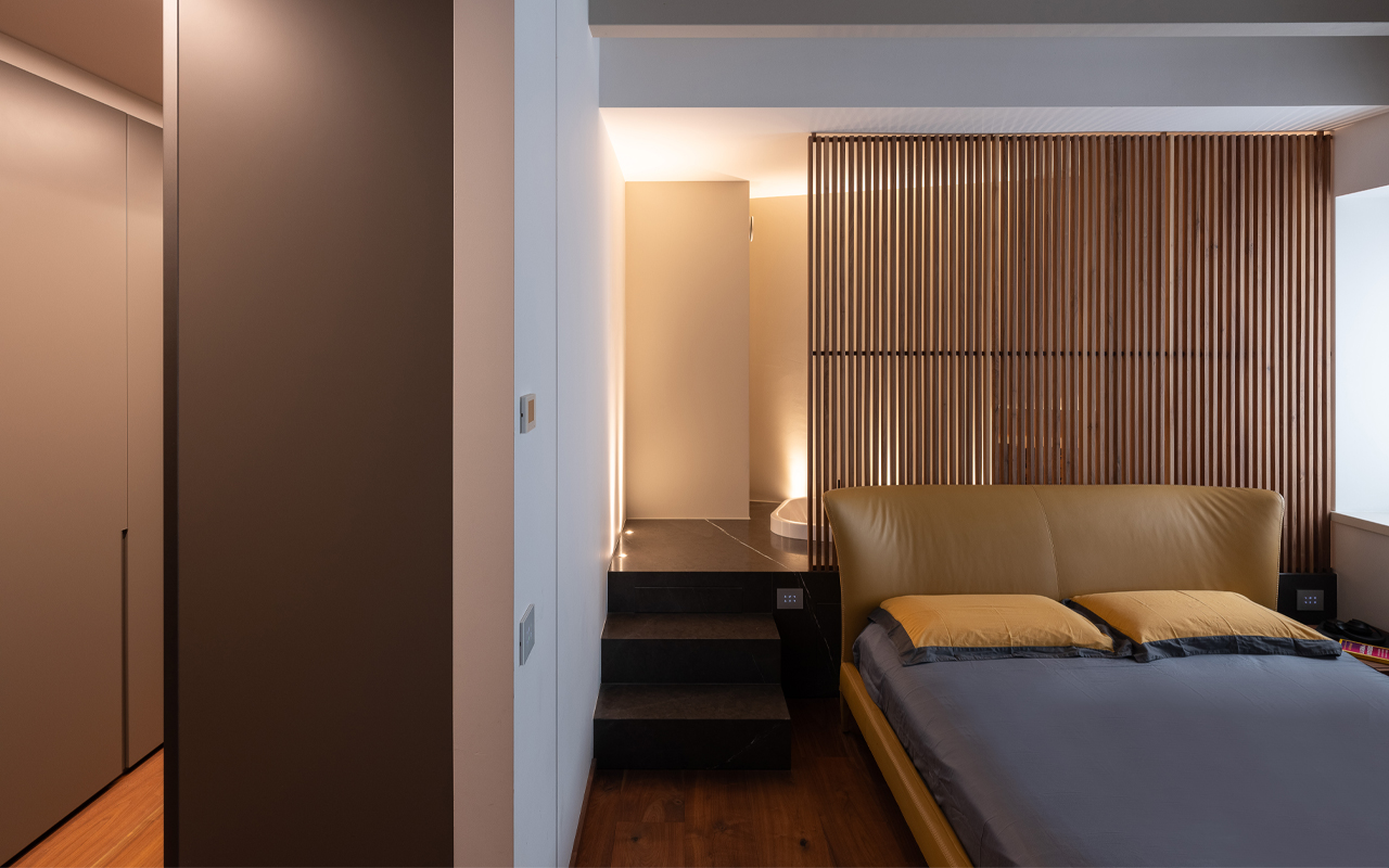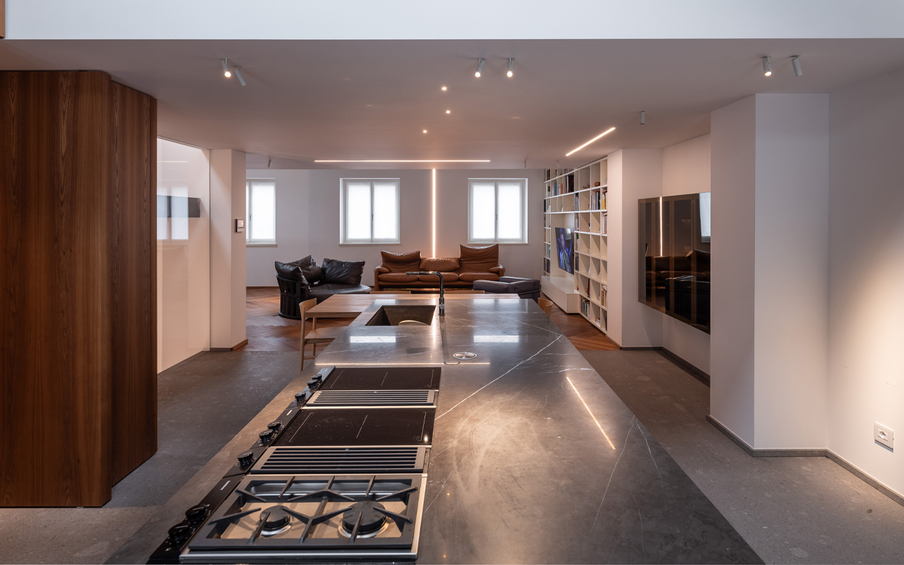 The guiding principle of the project was the choice of natural materials such as stone, wood and metal, which we find throughout the house. The flooring of the entrance and kitchen areas in pepper stone; the top of the kitchen in Grey Stone; the walnut parquet that heats the living area and the sleeping area; the important wooden panelling that integrates the appliances and hides the entrance to the service kitchen; the staircase, completely made of iron sheet. This is the box that houses designer furniture by Cassina, Poltrona Frau, Porro and Maxalto, creating the perfect home for its inhabitants. Last but not least, the lighting project has also been completely redesigned and designed by Zenucchi: light blades and spotlights alternate and accompany us in all environments. A cleverly designed architectural light, combined with decorative elements that soften the atmosphere.