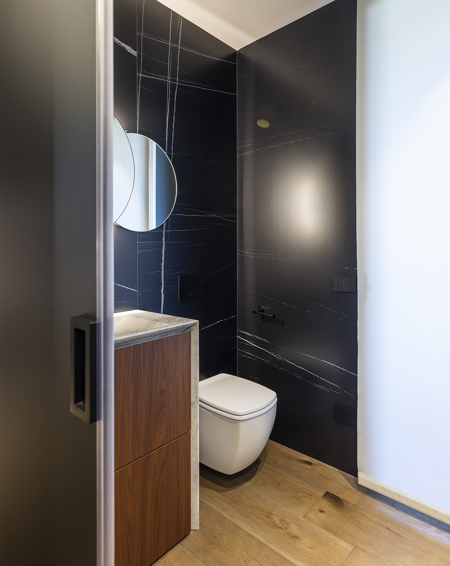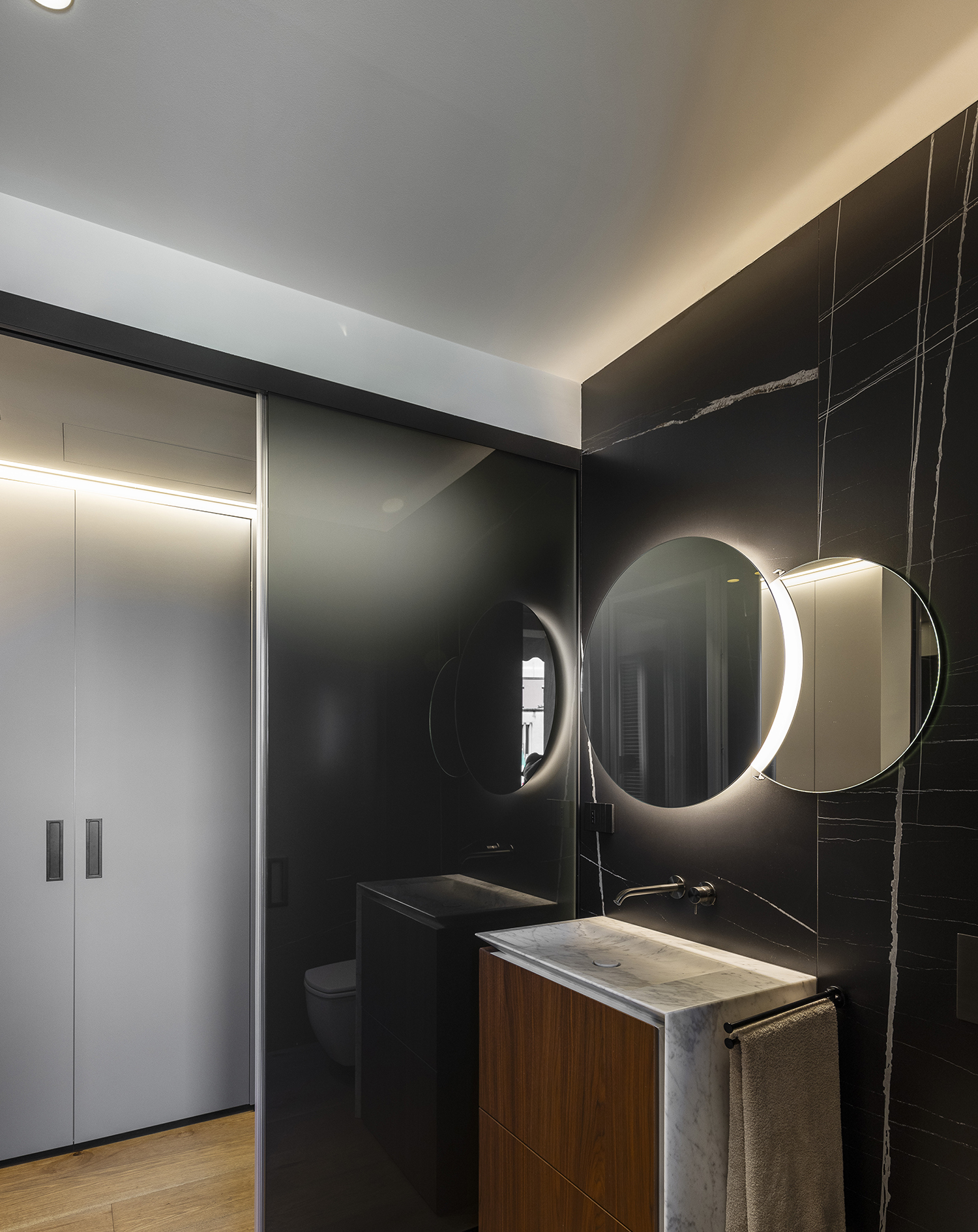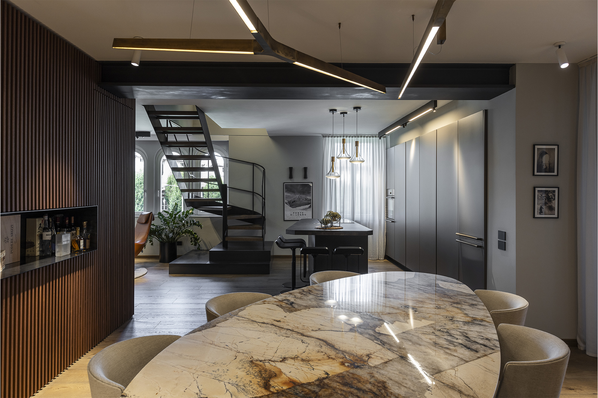When a young family of four decided to renovate their apartment near Lake Iseo, their vision was clear: to create a warm and welcoming home featuring a spacious open space with a contemporary aesthetic and luxury details. A place where they could spend quality time together, surrounded by high-end materials, bespoke design solutions, and refined style. Having previously furnished their second home, the family once again turned to Zenucchi Design Code to transform their two-level apartment into a sophisticated and functional living space. The main floor was designed as a large open space that seamlessly connects the kitchen and living area, creating a harmonious dialogue between the spaces. The kitchen, by Poliform, features an elegant anthracite tone with an HPL countertop, an operational island, and a wall unit with retractable doors that conceal the sink and pantry. Lapalma stools complete the ensemble with a touch of minimalism. The living area is centered around a spacious Flexform corner sofa, complemented by a Baxter pouf and a Vitra leather armchair with a matching footrest. The fireplace is integrated into a partition with a brass-clad finish, while the TV area stands out with its marble-effect design and a suspended, matte lacquered unit. A sophisticated walnut boiserie system adorns part of the wall, extending into the dining area, incorporating a raw iron niche and ending with a random-effect mirrored finish. The TV wall is completed by a Gallotti&Radice bookcase. In the dining area, the Baxter table with a Patagonia marble top is paired with Flexform chairs, while a pair of Maxalto sideboards add extra storage. Outside, on the terrace, a cozy Roda swing chair with a matching side table provides the perfect spot to relax in the open air. An elegant hallway discreetly hides a built-in laundry space, optimizing functionality without compromising style. The guest bathroom, adorned with marble-effect gres, features a sleek freestanding Boffi washbasin unit and an Agape mirror, creating a sophisticated and minimalist atmosphere.