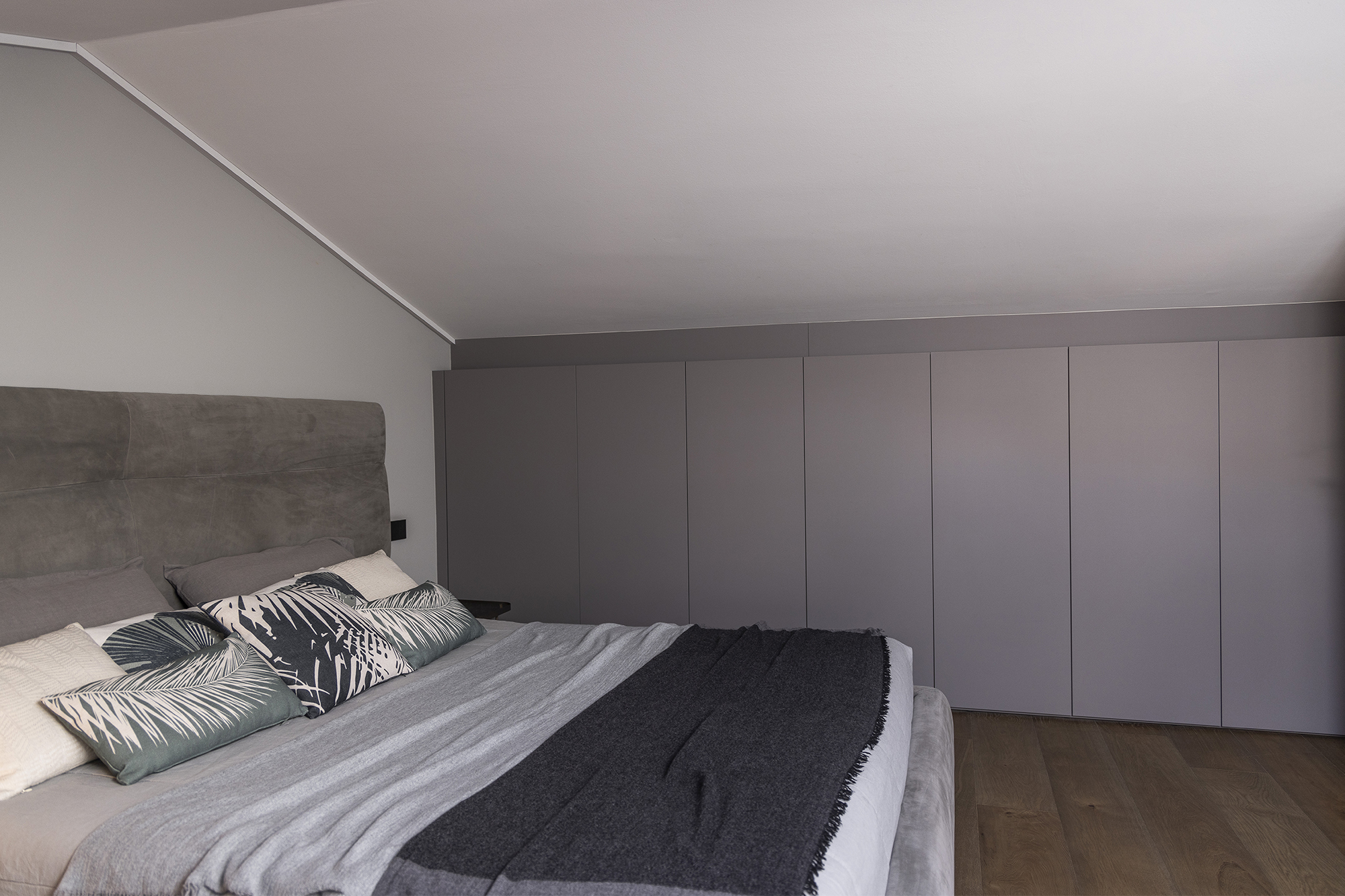 A custom-designed central staircase in painted iron with wooden steps connects the main floor to the mansard-style night area. The first two steps in iron blend seamlessly with the supporting structure that wraps around the wooden steps, creating a striking architectural statement. The master bedroom is furnished with a refined Baxter bed, while the children’s rooms are personalized with Gervasoni beds and Vitra chairs for their study areas. All wardrobes, desks, and additional furnishings were custom-designed to adapt perfectly to the varying heights of the attic, ensuring optimal use of space. In the night area bathroom, a bespoke washbasin unit houses an elegant Agape countertop sink, seamlessly integrating with the overall refined aesthetic of the project. Great care was taken in selecting high-quality materials and lighting solutions. The oak parquet flooring adds warmth to the interiors, while the bathrooms are enhanced with marble-effect gres coverings. The terrace flooring was specifically chosen to complement the home’s overall aesthetic. Lighting, both architectural and decorative, plays a fundamental role in shaping the ambiance. Renowned brands such as Flos, Davide Groppi, and Henge were selected to strike the perfect balance between beauty and functionality. Additionally, Zenucchi Design Code provided a complete supply for the bathrooms, including faucets, sanitary fixtures, and showers, selecting premium brands such as Agape, Boffi, and Cea. This project perfectly embodies the fusion of elegance, functionality, and personalization. Thanks to the meticulous attention of Zenucchi Design Code, the family now enjoys a home that fully reflects their lifestyle—contemporary, welcoming, and enriched with exclusive details that make it truly one of a kind.