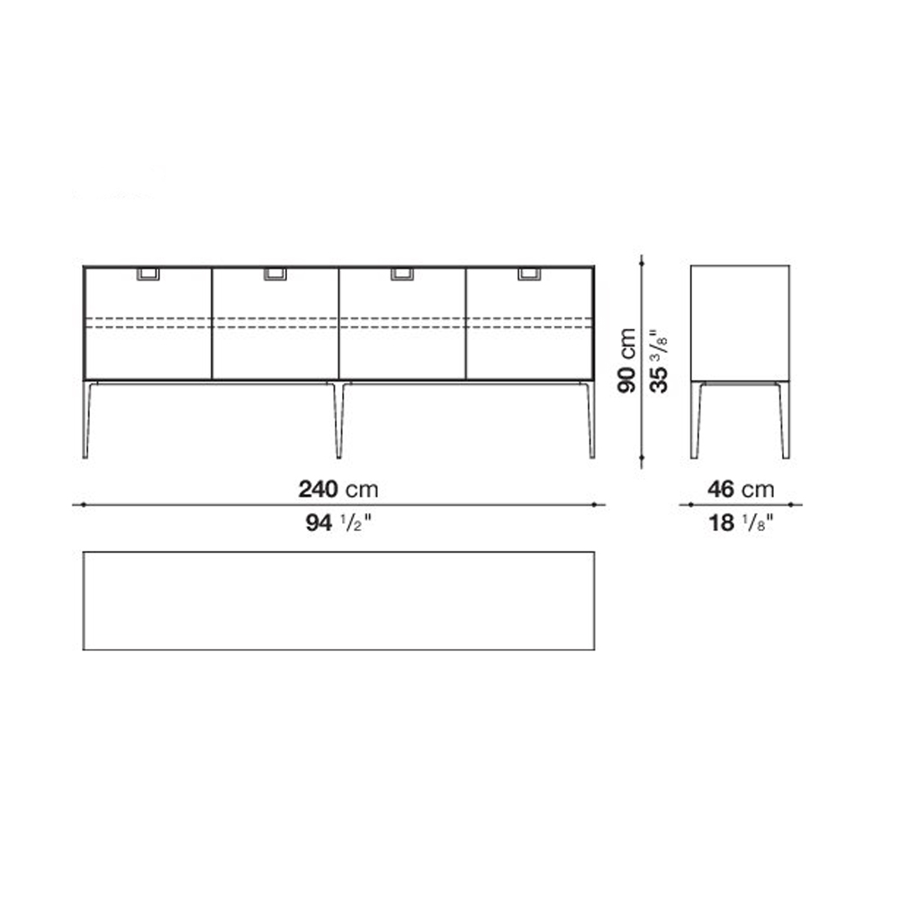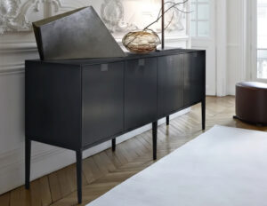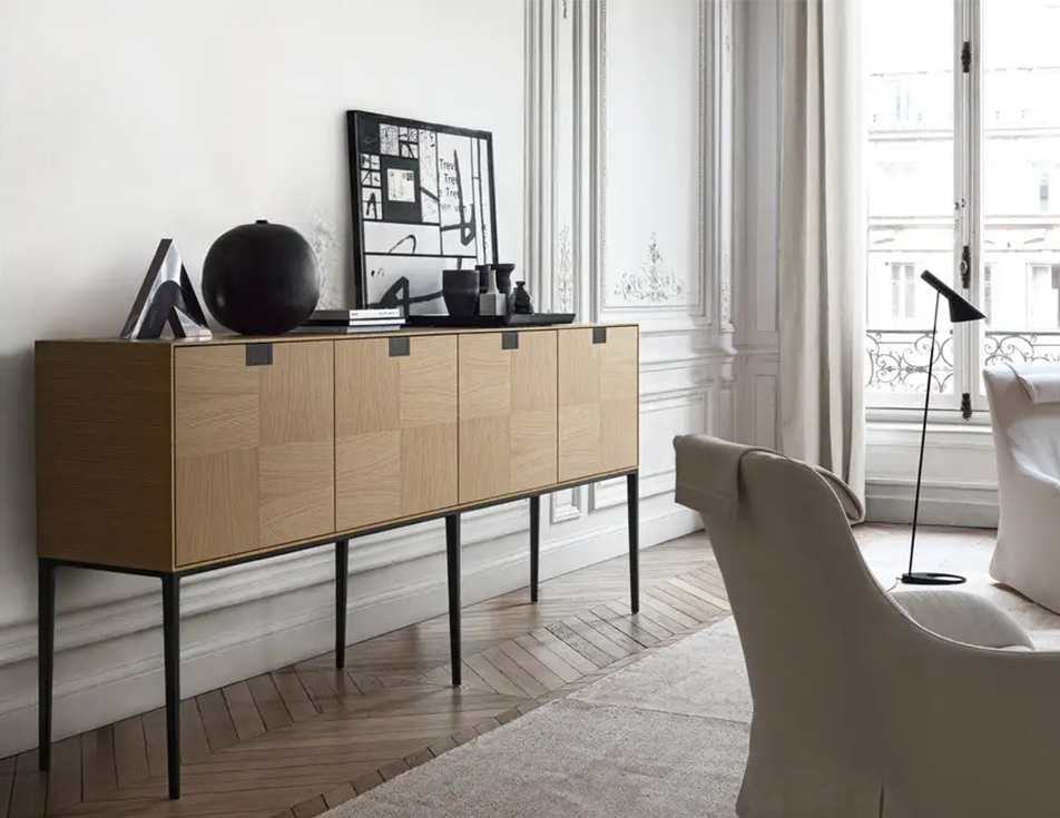Alcor is a four-door sideboard with a precise design, defined by wood surfaces finished with a lacquered-rubber effect. The color variation evokes oriental inspirations, showcasing exceptional artisanal craftsmanship, while the lightweight structure with aluminum supports balances its formal character. A designer storage unit by MaxAlto, conceived for both living and office spaces.