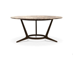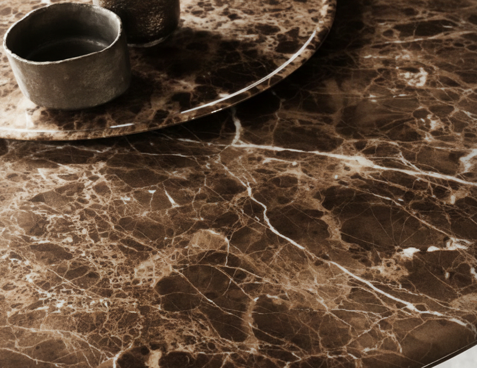 The Astrum round table by MaxAlto combines contemporary design with artisanal tradition, featuring a round Emperador marble top with soft, refined edges. The trestle-style base, made of die-cast aluminum in an amber finish, provides both solidity and visual lightness, becoming a distinctive element of the design. The triangular section of the support enhances the balance between technical precision and material warmth, highlighting the table’s character. A designer round table ideal for elegant dining rooms, created to welcome with style and personality.