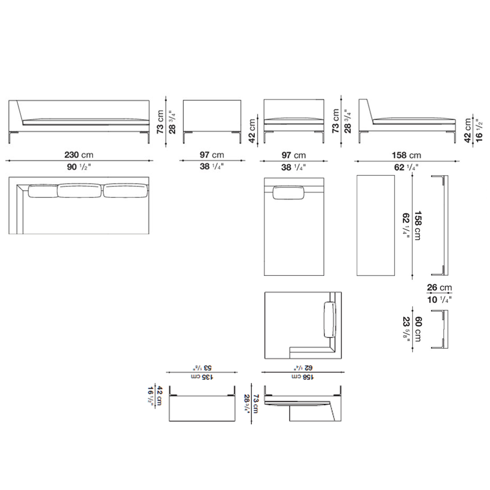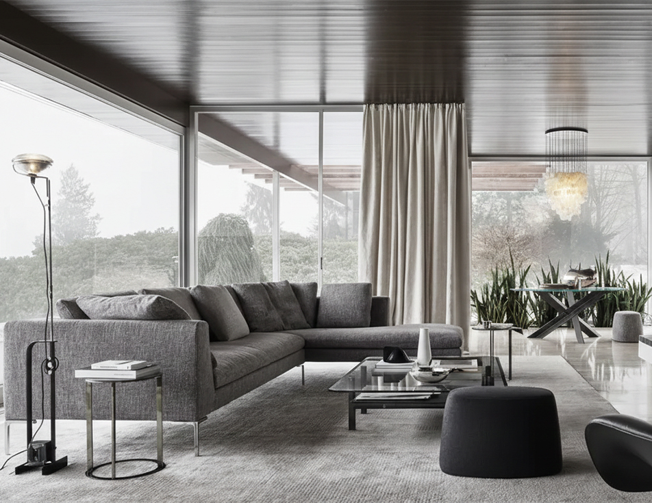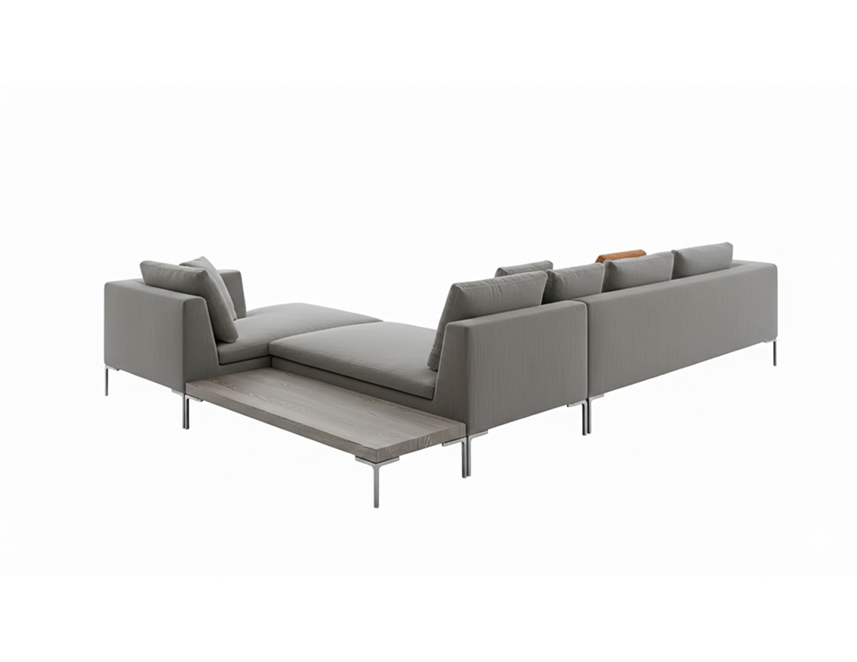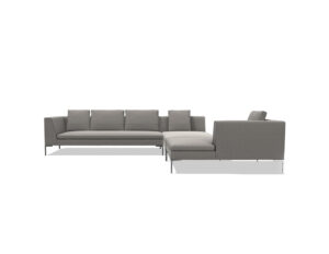 An icon of contemporary design, the Charles sofa by B&B stands out for its light and refined aesthetic, characterized by inverted “L” shaped aluminum legs and clean, essential lines. This high-end modular system allows for endless configurations-linear sofa, chaise longue, or corner arrangement for personalized comfort. Completed with low wooden tables, it is available in fabric or leather upholstery, making it ideal for furnishing modern and elegant living spaces.