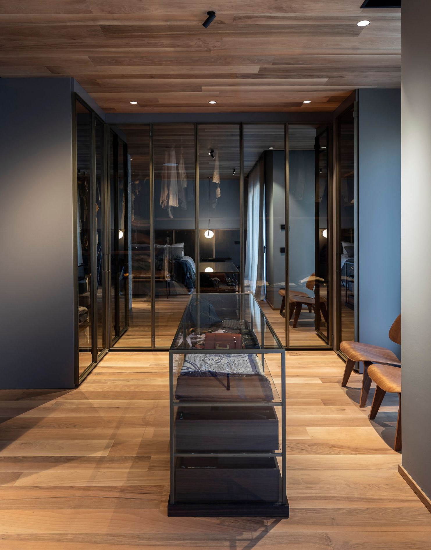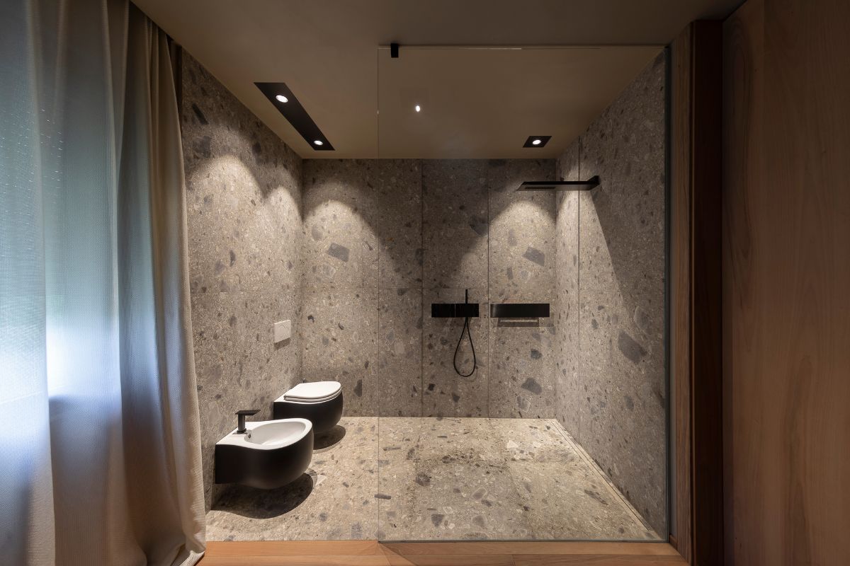 Questo legno nobile, impiegato in particolare per pavimenti e soffitti crea un continuum visivo e materico che lega le varie stanze della casa. Il Ceppo di Gré® invece, con le sue tonalità grigie e le venature irregolari, è stato utilizzato per rivestimenti e dettagli strutturali, ma anche per i bagni, per le boiserie del soggiorno e quella della tv nella camera padronale e ancora per il piano cucina, conferendo all’ambiente un carattere energico ma elegante. Un materiale, tipico dell’architettura lombarda, che ha il pregio di integrarsi armoniosamente con il contesto, risultando al contempo ricercato e familiare. Un altro elemento distintivo magistralmente utilizzato è il ferro grezzo, impiegato per creare dettagli strutturali e decorativi come la boiserie della zona tv, la testata del letto e la porta a bilico integrata nella boiserie che accede alla zona notte, che aggiungono un tocco industriale e contemporaneo all’abitazione. Queste superfici, naturali e non trattate, dialogano perfettamente con gli altri materiali, introducendo un contrasto visivo e tattile che rende lo spazio dinamico e interessante. Non mancano elementi di design che rimano perfettamente con quelli su misura arricchendo il contesto di note immediatamente riconoscibili e chic. Ancora una volta Zenucchi è riuscito a mixare con gusto e maestria ogni ambiente rendendolo perfetto e vibrante nelle corde dei suoi abitanti che sull’architettura di famiglia e sulla sua storia passata possono ora spargere nuove emozioni.