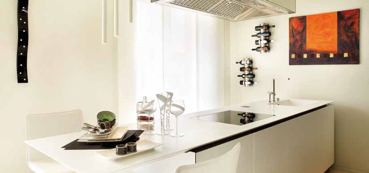 Il risultato è una forte unità compositiva da cui l’abitare acquista una valenza moderna, radicata nella natura tradizionale dei materiali grezzi di partenza. Tale sensazione è percepita fin dall’ingresso, dove ad accoglierci troviamo una libreria in lamiera di ferro cerata contrapposta ad un armadio laccato color ghiaccio. Nel living ampio e scenografico il camino con basamento in pietra cardoso e cappa rivestita in metallo. Al centro un grande tavolo con piano in vetro; a parete mobili in legno di rovere laccato color moka con schienale granito. In cucina isola attrezzata con contenitivi laccati bianco e top in Corian® sagomato, materiale prezioso per modellabilità e durevolezza, che ben si accosta alla natura della materia che lo circonda. Completa l’effetto finale lo studio illuminotecnico che fa uso di faretti ed appliques per gestire al meglio la luce artificiale, mirata e mai invasiva.