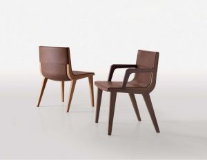 Le sedie Acanto, con o senza braccioli, presentano strutture in massello a contenimento di comode sedute rivestite in tessuto o pelle; un’ulteriore versione, con le medesime caratteristiche strutturali, svolge la funzione di seduta da conversazione.