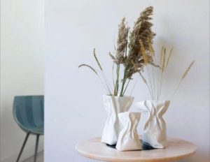 Il vaso a forma di sacchetto di carta è ispirato ai sacchetti usati per il pane, nei quali le pieghe che si formano naturalmente sulla carta sono state solidificate nella porcellana. Il risultato dell’intero processo di conversione del materiale, è un’esperienza visiva leggera e senza peso. Il bianco è il colore più sensibile ai colori ambientali circostanti e alla luce, rafforza il ritmo delle pieghe e offre un senso di rilassamento e serenità. La purezza e la trasparenza uniche della porcellana rendono questi vasi un’opera sensibile e fragile.