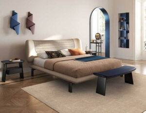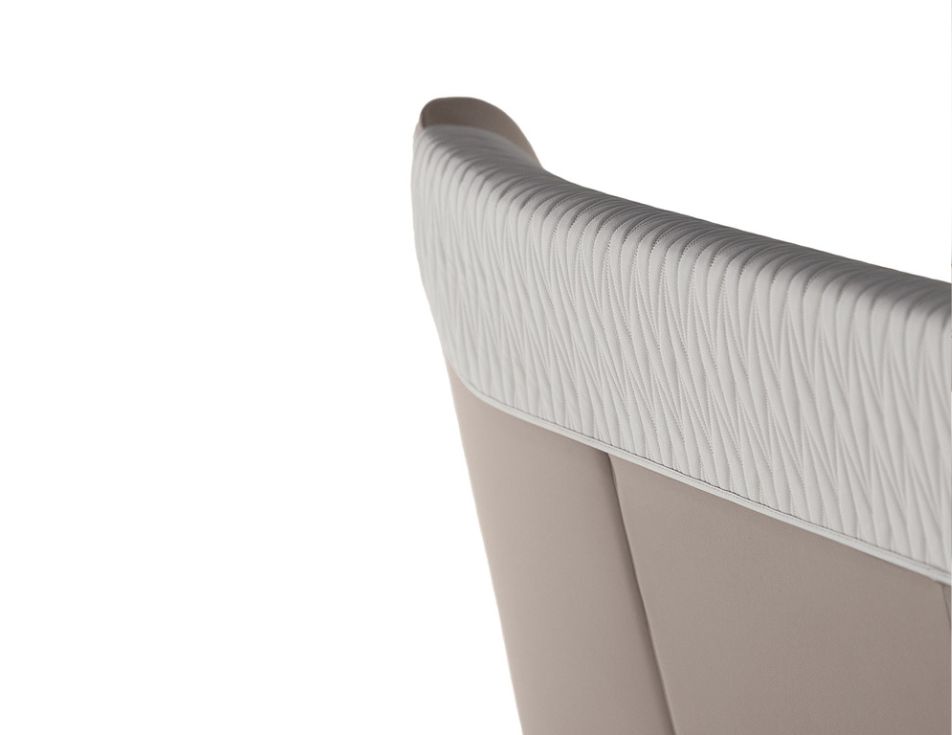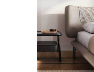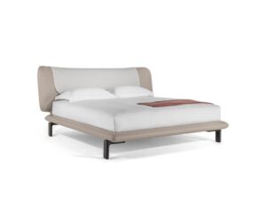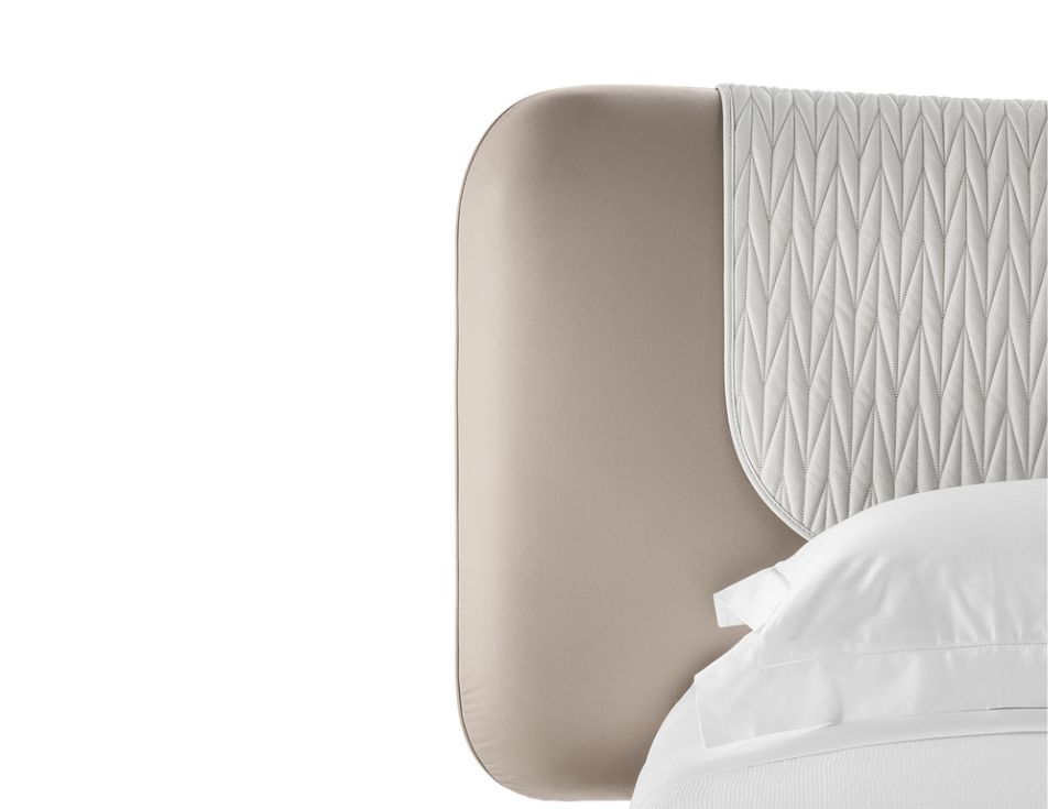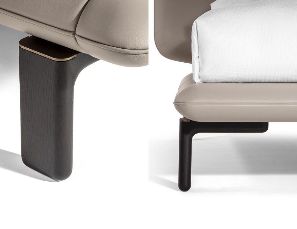 Duo nasce dall’incontro tra due eccellenze del design italiano che combinano la maestria della lavorazione del cuoio con l’abilità artigianale della falegnameria. La collezione, firmata da Roberto Lazzeroni, riprende le suggestioni dell’Italian Style degli anni ’50, reinterpretandole in chiave contemporanea attraverso forme morbide e dettagli raffinati. La struttura in acciaio è avvolta da una leggera imbottitura. La testiera imbottita e sospesa si estende oltre la struttura con un effetto avvolgente ed è caratterizzata da una trapunta rimovibile decorativa con una lavorazione matelassé. Il logo Poltrona Frau è impresso a caldo ed è posizionato sul retro della testata. Gambe laterali in frassino tinto Wengè a forma di “L”.