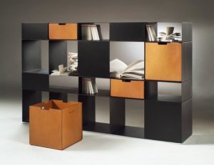 Libreria in metallo smaltata a polveri composto da: n.02 box scatola da 40x40x40 cm in cuoio color tabacco; n.02 box scatola da 40x40x20 h. cm in cuoio colore tabacco; n.02 elemento da 40x40x20 h. cm; n.02 elemento da 80x40x20 h. cm; n.06 elemento da 120x40x20 h. cm; n.03 elemento da 40x40x40 h. cm; n.03 elemento da 120x40x40 h. cm; n.02 basamento da 80×40 cm; n.01 basamento da 120×40 cm; n.01 top da 40×40 cm; n.02 top da 120×40 cm