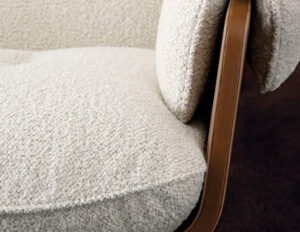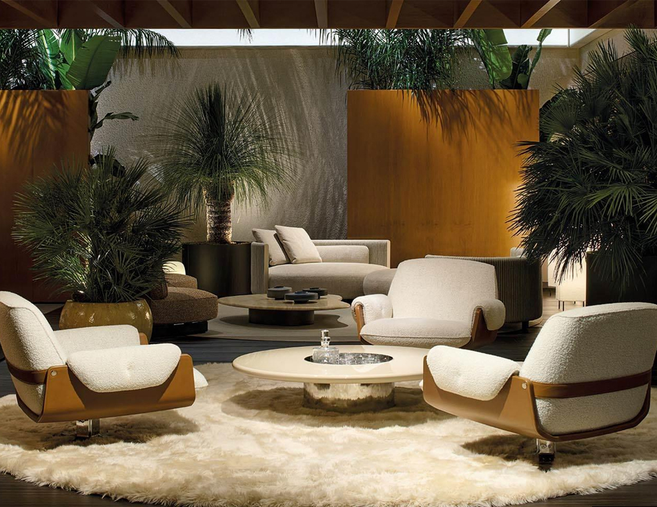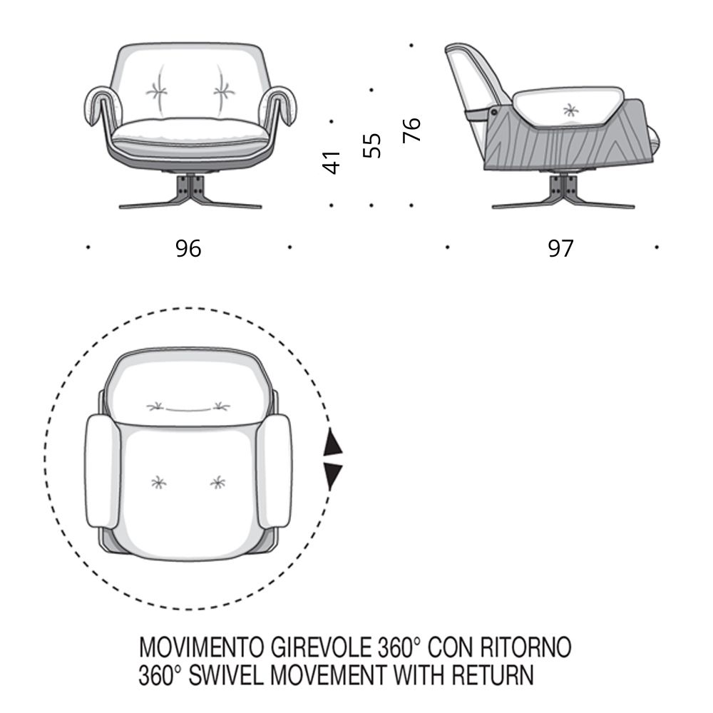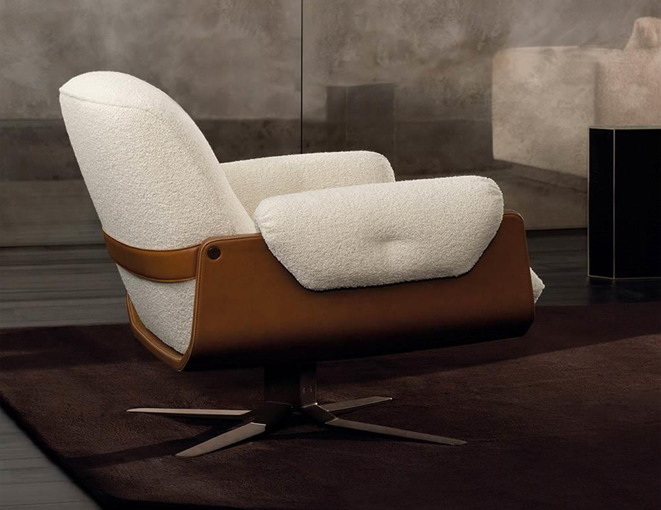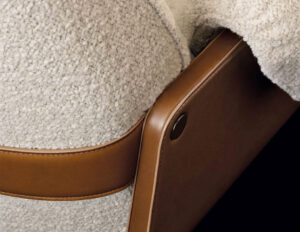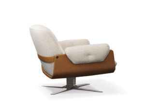 La poltrona Laurel firmata da Giampiero Tagliaferri attinge a forme ed elementi stilistici Mid-Century per un progetto unico e senza tempo. La scocca delle sedute in pelle accoglie i cuscini di seduta e schienale, ritmati da impunture sartoriali, e si innalza verso l’alto per sostenere la morbida cuscinatura dei braccioli. Il retro della poltrona, dalla forte personalità, è arricchito da una fascia in tessuto, come fosse una martingala, in corrispondenza di due preziose borchie in metallo poste sui lati della scocca, presenti anche nella variante poltroncina. La base della poltrona girevole a 360° con ritorno e del poggiapiedi è costituita da razze in metallo piegate e fissate a un montante verticale.