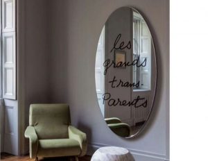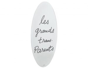 Les Grands Trans-Parents, firmato da Man Ray per Cassina, è uno specchio ellittico serigrafato con supporto in poliuretano rigido. Produzione in serie dell’opera originale di Man Ray del 1938: un gioco di parole scritto su uno specchio più grande.