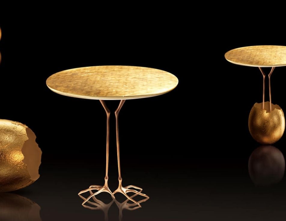 Traccia fa parte della colIezione Ultramobile Collection voluta da Dino Gavina per Simon. Il piano ellittico di questo tavolino ha il bordo sagomato, con impresse le impronte di un uccello fantastico, lo stesso che ha ispirato i piedi realizzati in fusione di bronzo della rinomata scultura Table with bird legs. La parte superiore del piano è in foglia d’oro zecchino 24 carati, il sottopiano è trattato con vernici pigmentate color oro. Opere d’autore che diventano arredi da collezione.